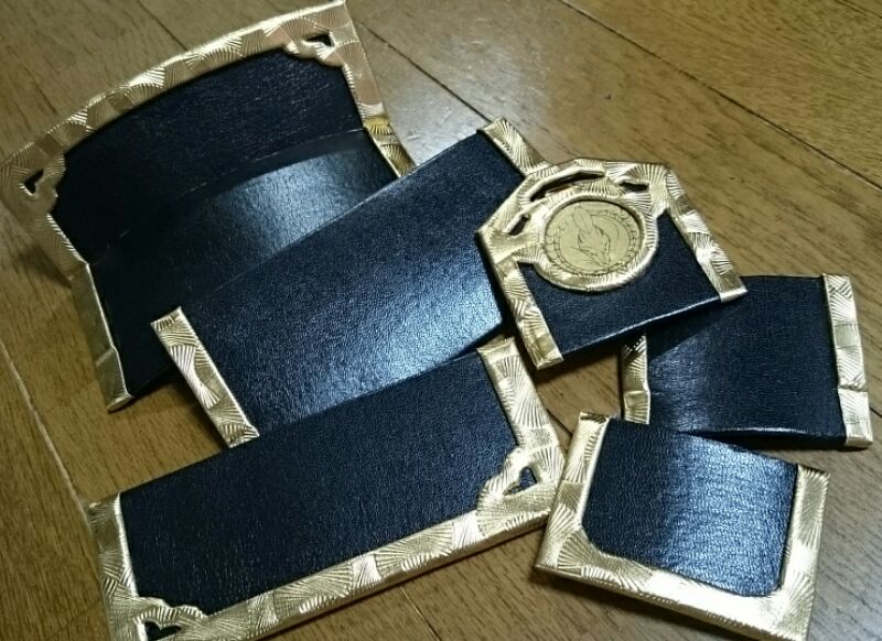 3mmのウレタンに黒合皮を貼って、金の合皮を貼った2mmのウレタンを重ねて貼ってます。