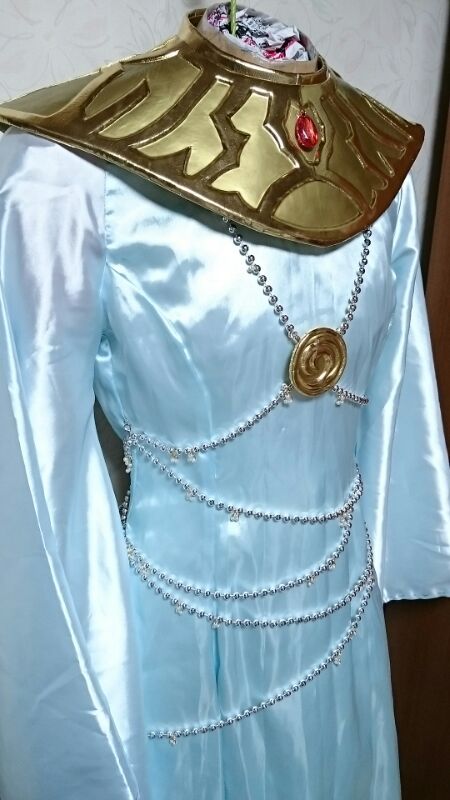 昔作った白いドレスが丁度あったので水色に染めて再利用!!司馬懿のズボン染める時に使った液の余りで染めました!!結局司馬懿のは綺麗にグラデーションにならなかったからスプレーしたんですがね。。。ドレスは淡く染まってくれて良かったです。