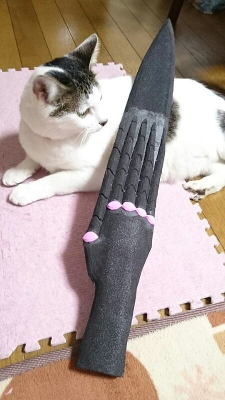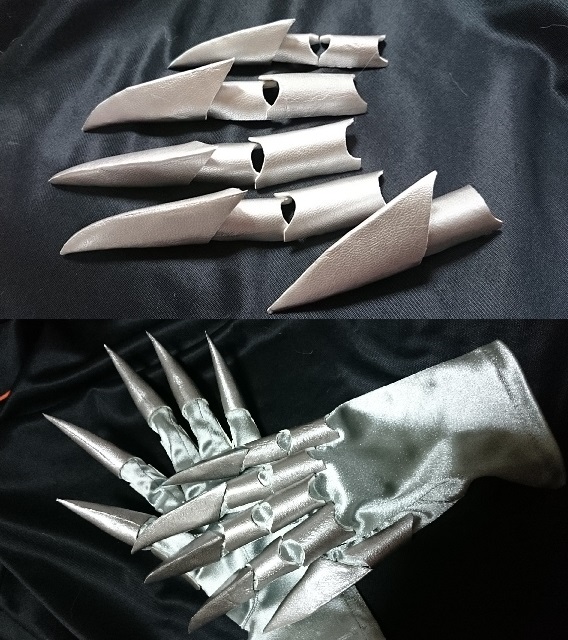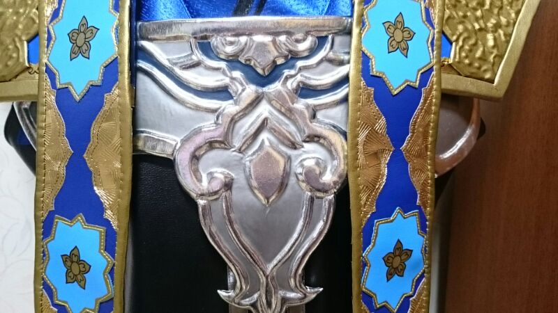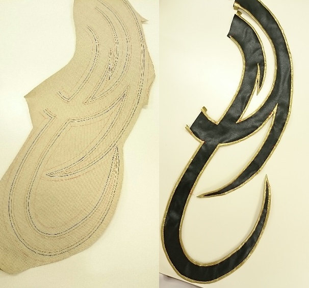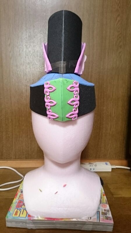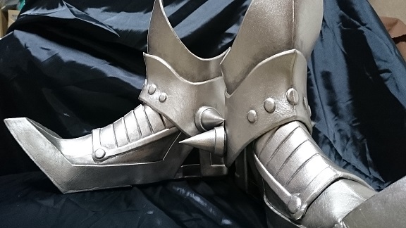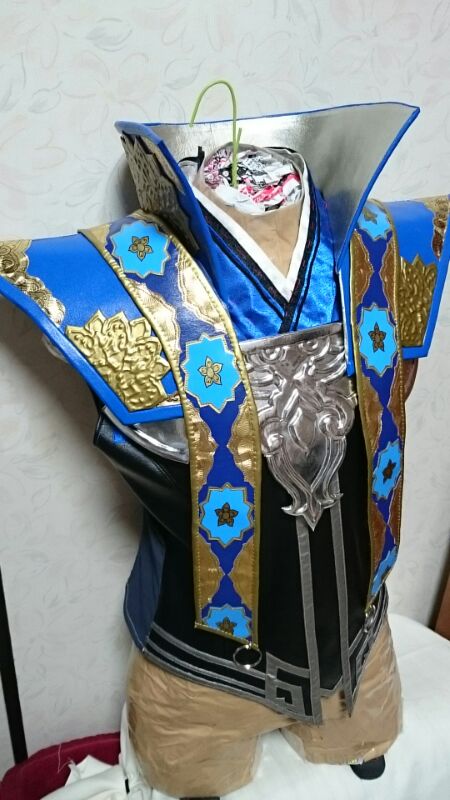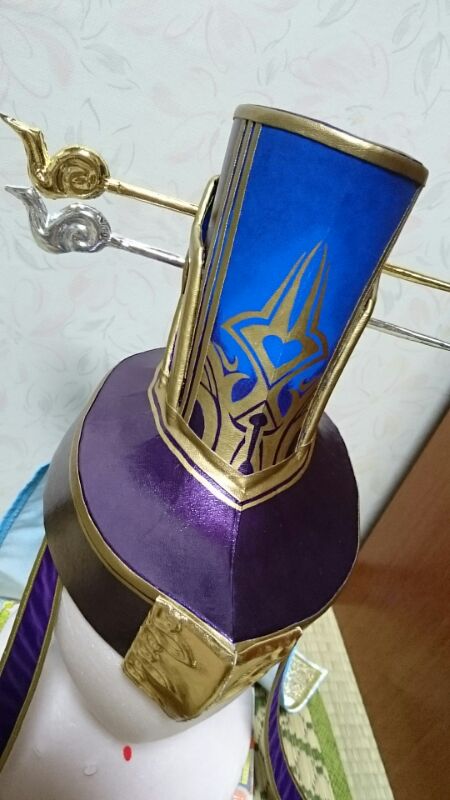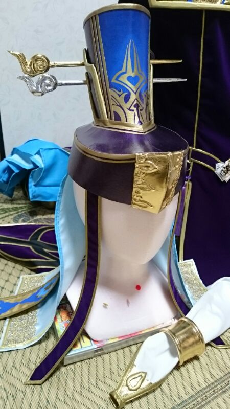 とりあえず合皮貼りました。これから紫色に塗装します!上着と同じ生地貼りたかったんですが、表面がケバケバしてて模様書けない生地だったのでね!